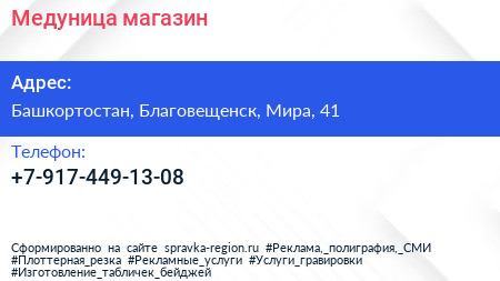 Медуница, магазин по адресу Башкортостан, Благовещенск, Мира, 41 в дальнейшем Организация, размещена в следующих категориях: