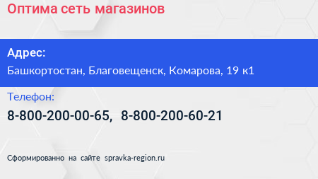Оптима, сеть магазинов по адресу Башкортостан, Благовещенск, Комарова, 19 к1 в дальнейшем Организация, размещена в следующих категориях: