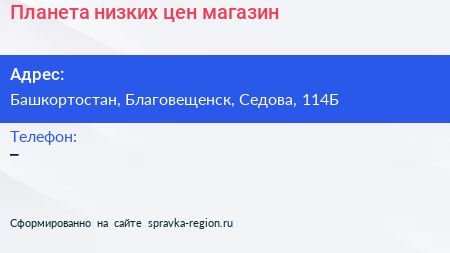 Планета низких цен, магазин по адресу Башкортостан, Благовещенск, Седова, 114Б в дальнейшем Организация, размещена в следующих категориях: