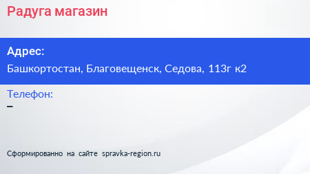 Радуга, магазин по адресу Башкортостан, Благовещенск, Седова, 113г к2 в дальнейшем Организация, размещена в следующих категориях: