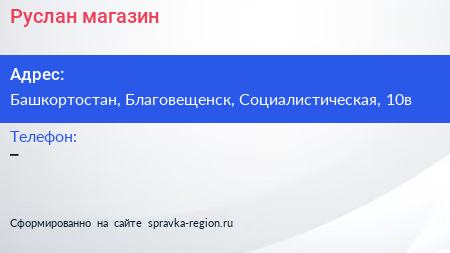 Руслан, магазин по адресу Башкортостан, Благовещенск, Социалистическая, 10в в дальнейшем Организация, размещена в следующих категориях:
