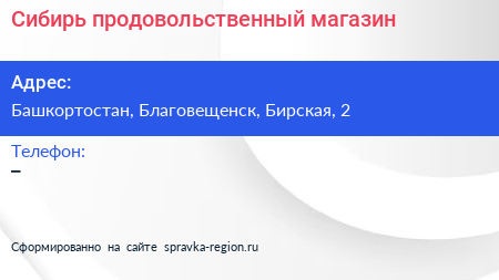 Сибирь, продовольственный магазин по адресу Башкортостан, Благовещенск, Бирская, 2 в дальнейшем Организация, размещена в следующих категориях: