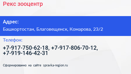 Рекс, зооцентр по адресу Башкортостан, Благовещенск, Комарова, 23/2 в дальнейшем Организация, размещена в следующих категориях: