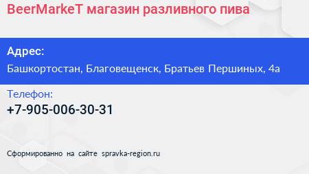 BeerMarkeT, магазин разливного пива по адресу Башкортостан, Благовещенск, Братьев Першиных, 4а в дальнейшем Организация, размещена в следующих категориях: