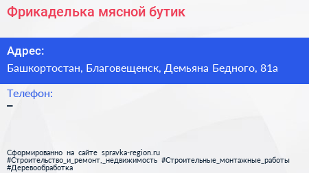 Фрикаделька, мясной бутик по адресу Башкортостан, Благовещенск, Демьяна Бедного, 81а в дальнейшем Организация, размещена в следующих категориях: