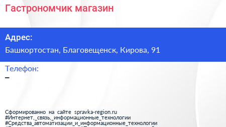 Гастрономчик, магазин по адресу Башкортостан, Благовещенск, Кирова, 91 в дальнейшем Организация, размещена в следующих категориях: