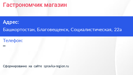 Гастрономчик, магазин по адресу Башкортостан, Благовещенск, Социалистическая, 22а в дальнейшем Организация, размещена в следующих категориях: