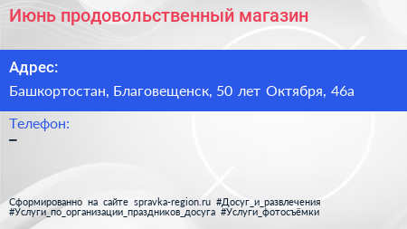 Июнь, продовольственный магазин по адресу Башкортостан, Благовещенск, 50 лет Октября, 46а в дальнейшем Организация, размещена в следующих категориях: