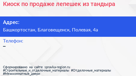Киоск по продаже лепешек из тандыра по адресу Башкортостан, Благовещенск, Полевая, 4а в дальнейшем Организация, размещена в следующих категориях: