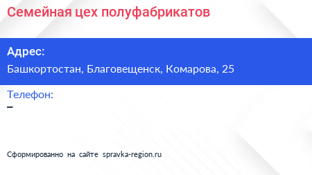 Семейная, цех полуфабрикатов по адресу Башкортостан, Благовещенск, Комарова, 25 в дальнейшем Организация, размещена в следующих категориях: