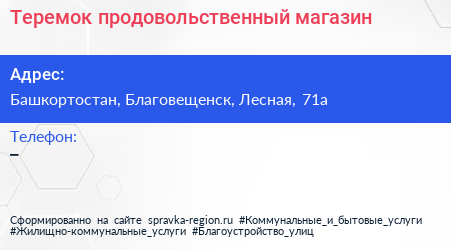 Теремок, продовольственный магазин по адресу Башкортостан, Благовещенск, Лесная, 71а в дальнейшем Организация, размещена в следующих категориях: