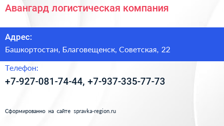 Авангард, логистическая компания по адресу Башкортостан, Благовещенск, Советская, 22 в дальнейшем Организация, размещена в следующих категориях: