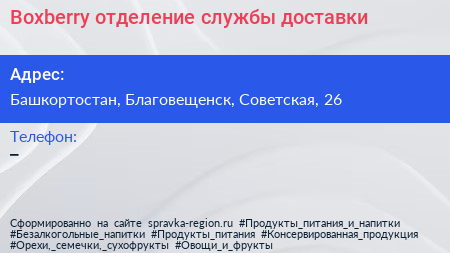 Boxberry, отделение службы доставки по адресу Башкортостан, Благовещенск, Советская, 26 в дальнейшем Организация, размещена в следующих категориях: