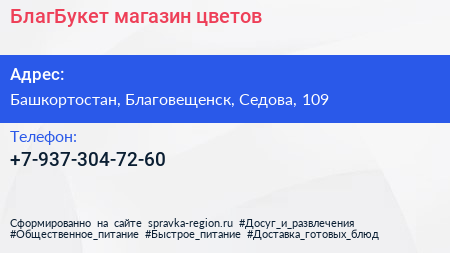 БлагБукет, магазин цветов по адресу Башкортостан, Благовещенск, Седова, 109 в дальнейшем Организация, размещена в следующих категориях: