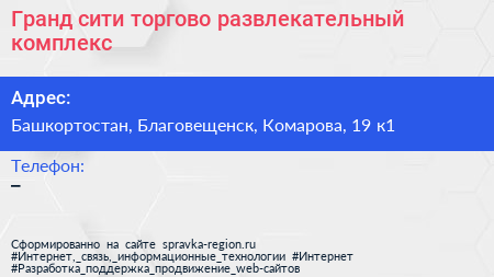 Гранд сити, торгово-развлекательный комплекс по адресу Башкортостан, Благовещенск, Комарова, 19 к1 в дальнейшем Организация, размещена в следующих категориях:
