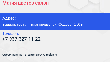 Магия цветов, салон по адресу Башкортостан, Благовещенск, Седова, 110Б в дальнейшем Организация, размещена в следующих категориях: