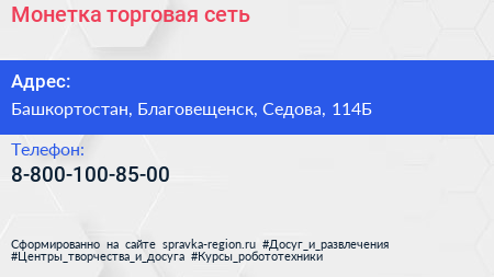 Монетка, торговая сеть по адресу Башкортостан, Благовещенск, Седова, 114Б в дальнейшем Организация, размещена в следующих категориях: