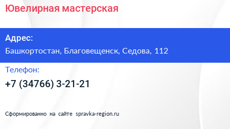 Ювелирная мастерская по адресу Башкортостан, Благовещенск, Седова, 112 в дальнейшем Организация, размещена в следующих категориях: