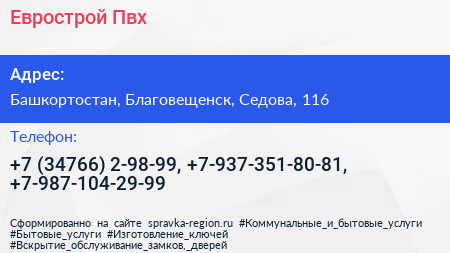 Еврострой-Пвх по адресу Башкортостан, Благовещенск, Седова, 116 в дальнейшем Организация, размещена в следующих категориях: