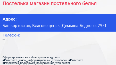 Постелька, магазин постельного белья по адресу Башкортостан, Благовещенск, Демьяна Бедного, 79/1 в дальнейшем Организация, размещена в следующих категориях: