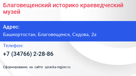 Благовещенский историко-краеведческий музей по адресу Башкортостан, Благовещенск, Седова, 2а в дальнейшем Организация, размещена в следующих категориях: