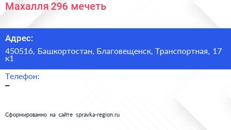 Махалля №296, мечеть по адресу 450516, Башкортостан, Благовещенск, Транспортная, 17 к1 в дальнейшем Организация, размещена в следующих категориях:
