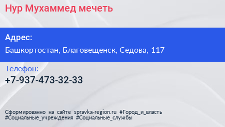 Нур-Мухаммед, мечеть по адресу Башкортостан, Благовещенск, Седова, 117 в дальнейшем Организация, размещена в следующих категориях: