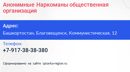 Анонимные Наркоманы, общественная организация по адресу Башкортостан, Благовещенск, Коммунистическая, 12 в дальнейшем Организация, размещена в следующих категориях: