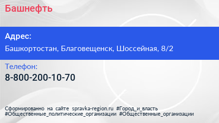 Башнефть по адресу Башкортостан, Благовещенск, Шоссейная, 8/2 в дальнейшем Организация, размещена в следующих категориях: