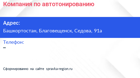 Компания по автотонированию по адресу Башкортостан, Благовещенск, Седова, 91а в дальнейшем Организация, размещена в следующих категориях: