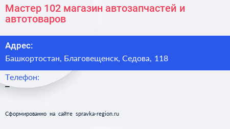 Мастер 102, магазин автозапчастей и автотоваров по адресу Башкортостан, Благовещенск, Седова, 118 в дальнейшем Организация, размещена в следующих категориях: