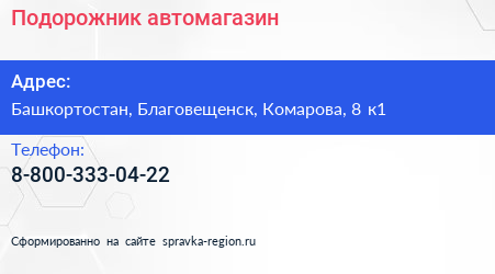 Подорожник, автомагазин по адресу Башкортостан, Благовещенск, Комарова, 8 к1 в дальнейшем Организация, размещена в следующих категориях: