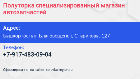 Полуторка, специализированный магазин автозапчастей по адресу Башкортостан, Благовещенск, Старикова, 127 в дальнейшем Организация, размещена в следующих категориях: