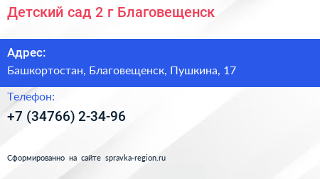 Детский сад №2, г. Благовещенск по адресу Башкортостан, Благовещенск, Пушкина, 17 в дальнейшем Организация, размещена в следующих категориях: