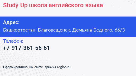 Study Up, школа английского языка по адресу Башкортостан, Благовещенск, Демьяна Бедного, 66/3 в дальнейшем Организация, размещена в следующих категориях:
