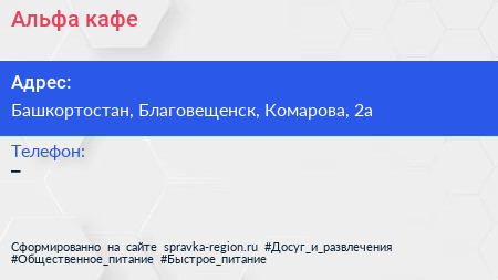 Альфа, кафе по адресу Башкортостан, Благовещенск, Комарова, 2а в дальнейшем Организация, размещена в следующих категориях: