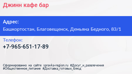 Джинн, кафе-бар по адресу Башкортостан, Благовещенск, Демьяна Бедного, 83/1 в дальнейшем Организация, размещена в следующих категориях: