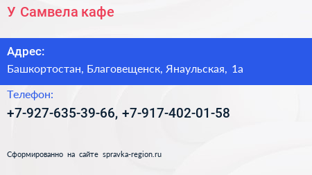 У Самвела, кафе по адресу Башкортостан, Благовещенск, Янаульская, 1а в дальнейшем Организация, размещена в следующих категориях: