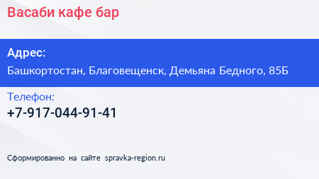 Васаби, кафе-бар по адресу Башкортостан, Благовещенск, Демьяна Бедного, 85Б в дальнейшем Организация, размещена в следующих категориях: