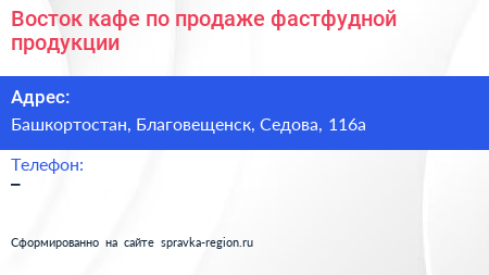 Восток, кафе по продаже фастфудной продукции по адресу Башкортостан, Благовещенск, Седова, 116а в дальнейшем Организация, размещена в следующих категориях: