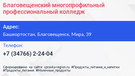 Благовещенский многопрофильный профессиональный колледж по адресу Башкортостан, Благовещенск, Мира, 39 в дальнейшем Организация, размещена в следующих категориях: