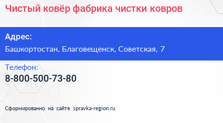 Чистый ковёр, фабрика чистки ковров по адресу Башкортостан, Благовещенск, Советская, 7 в дальнейшем Организация, размещена в следующих категориях: