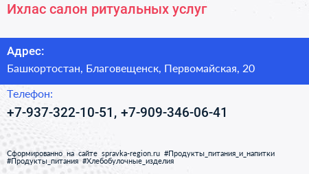 Ихлас, салон ритуальных услуг по адресу Башкортостан, Благовещенск, Первомайская, 20 в дальнейшем Организация, размещена в следующих категориях: