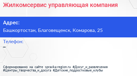 Жилкомсервис, управляющая компания по адресу Башкортостан, Благовещенск, Комарова, 25 в дальнейшем Организация, размещена в следующих категориях: