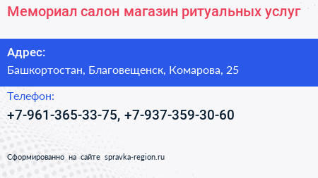 Мемориал, салон-магазин ритуальных услуг по адресу Башкортостан, Благовещенск, Комарова, 25 в дальнейшем Организация, размещена в следующих категориях: