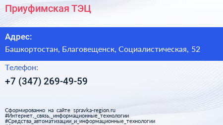 Приуфимская ТЭЦ по адресу Башкортостан, Благовещенск, Социалистическая, 52 в дальнейшем Организация, размещена в следующих категориях: