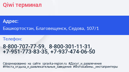 Qiwi, терминал по адресу Башкортостан, Благовещенск, Седова, 107/1 в дальнейшем Организация, размещена в следующих категориях: