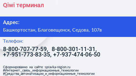 Qiwi, терминал по адресу Башкортостан, Благовещенск, Седова, 107в в дальнейшем Организация, размещена в следующих категориях: