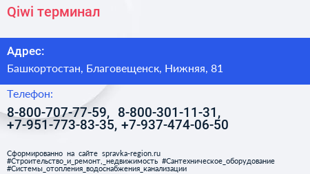 Qiwi, терминал по адресу Башкортостан, Благовещенск, Нижняя, 81 в дальнейшем Организация, размещена в следующих категориях: