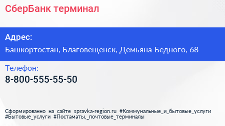 СберБанк, терминал по адресу Башкортостан, Благовещенск, Демьяна Бедного, 68 в дальнейшем Организация, размещена в следующих категориях: